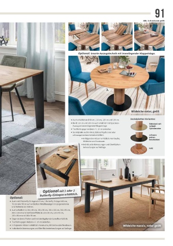 europäischer Nussbaum und Wildeiche. 3. System-Rundtisch Wildeiche natur geölt, Sockelplatte schwarz pulverbeschichtet, • Gegen Aufpreis: Platten auch mit durchgehender Lamelle erhältlich.